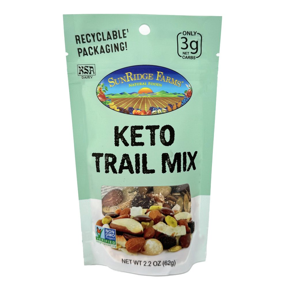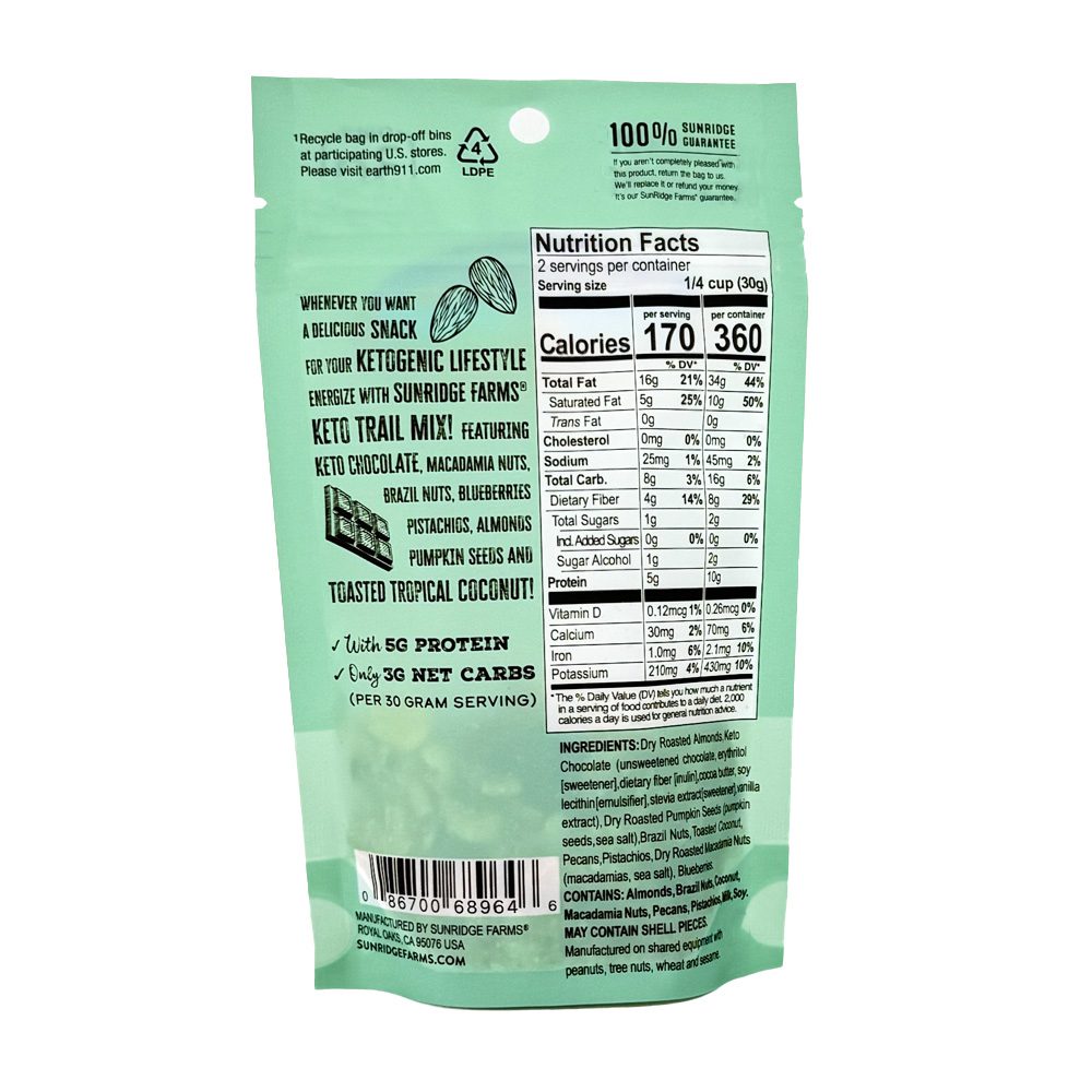 | Ingredients | Dry Roasted Almonds, Keto Chocolate (unsweetened chocolate, erythritol [sweetener], dietary fibre [inulin], cocoa butter, soy lecithin [emulsifier], stevia extract [sweetener], vanilla extract, milk), Dry Roasted Pumpkin Seeds (pumpkin seeds, sea salt), Brazil Nuts, Toasted Coconut, Pecans, Pistachios, Dry Roasted Macadamia Nuts (macadamias, sea salt), Blueberries. |