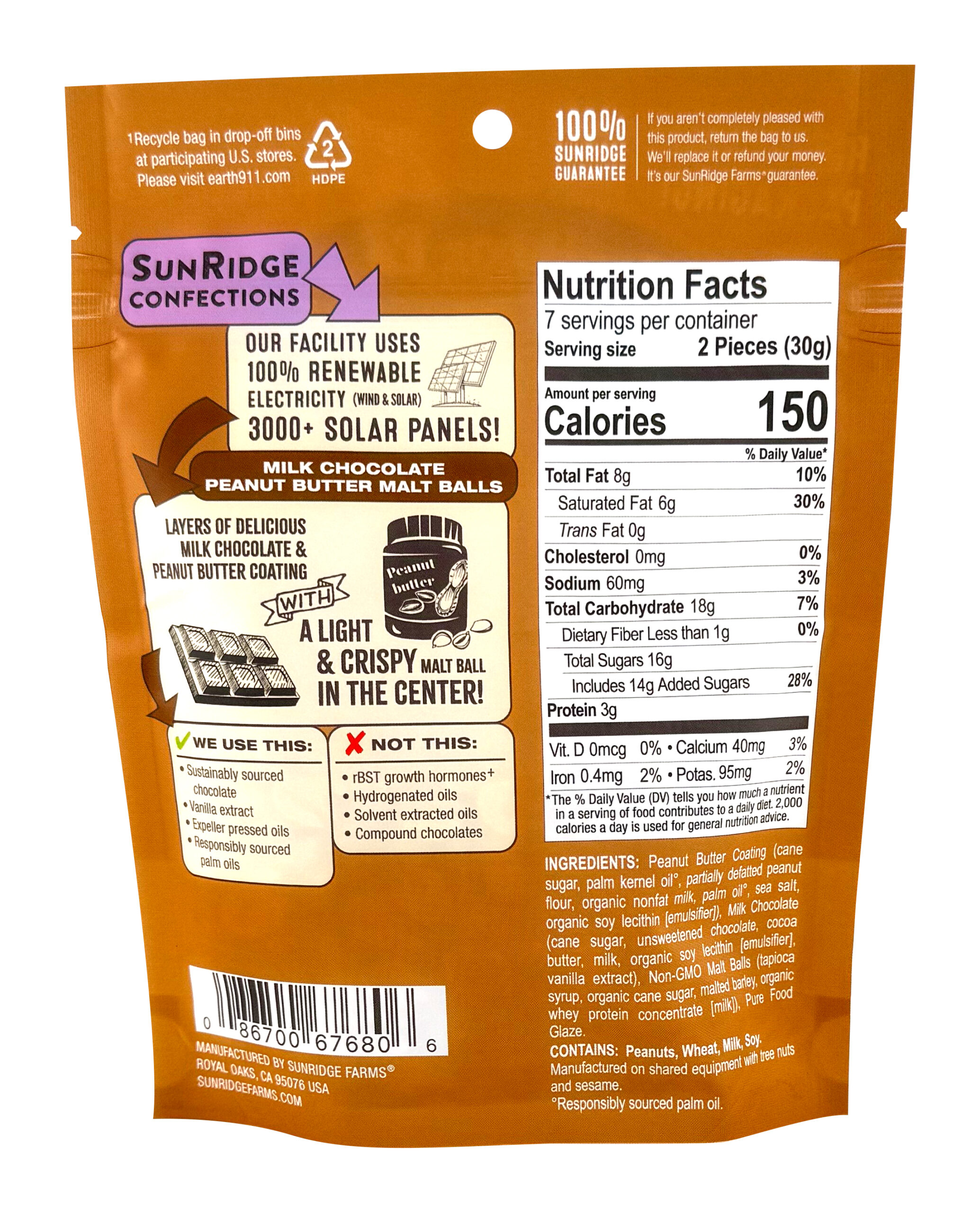 | Ingredients | Peanut Butter Coating (cane sugar, palm kernel oil*, partially defatted peanut flour, organic nonfat milk, palm oil*, sea salt, organic soy lecithin [ emulsifier]), Milk Chocolate (cane sugar, unsweetened chocolate, cocoa butter, milk, soy or sunflower lecithin [emulsifier], vanilla), Malt Balls (tapioca syrup, organic cane sugar, malted barley, organic whey protein concentrate [milk]), Pure Food Glaze. *Responsibly sourced palm oil |