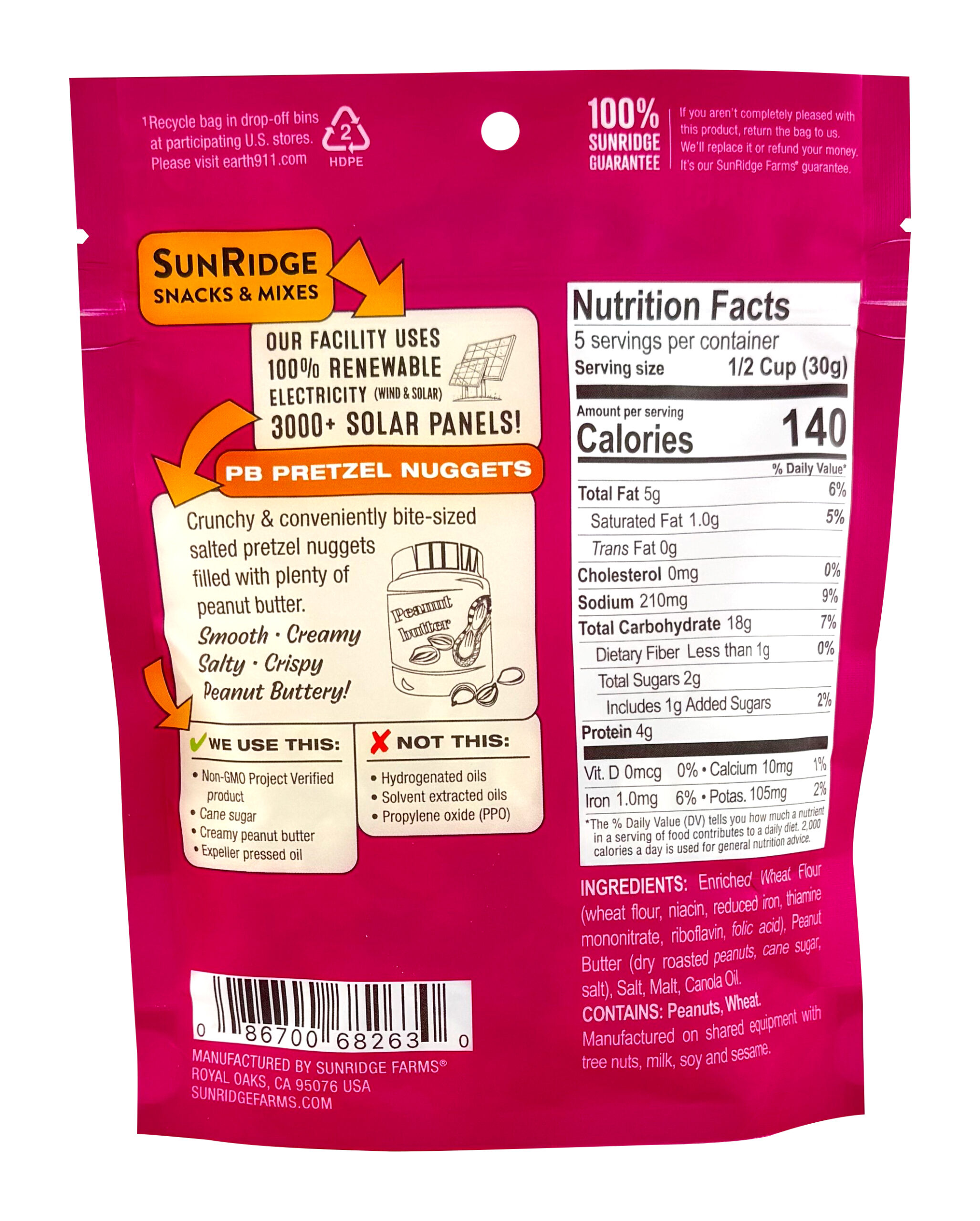 Ingredients Enriched Wheat Flour (wheat flour, niacin, reduced iron, thiamine mononitrate, riboflavin, folic acid), Peanut Butter (dry roasted peanuts, cane sugar, salt), Salt, Malt, Canola Oil.