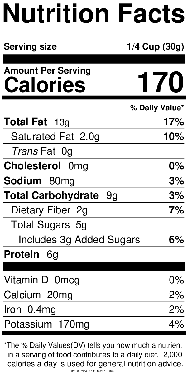 Ingredients | Dry Roasted Peanuts, Brown Sugar, Powdered Sugar (cane sugar, corn starch), Honey Powder (cane sugar, honey), Sea Salt, Gum Arabic. |