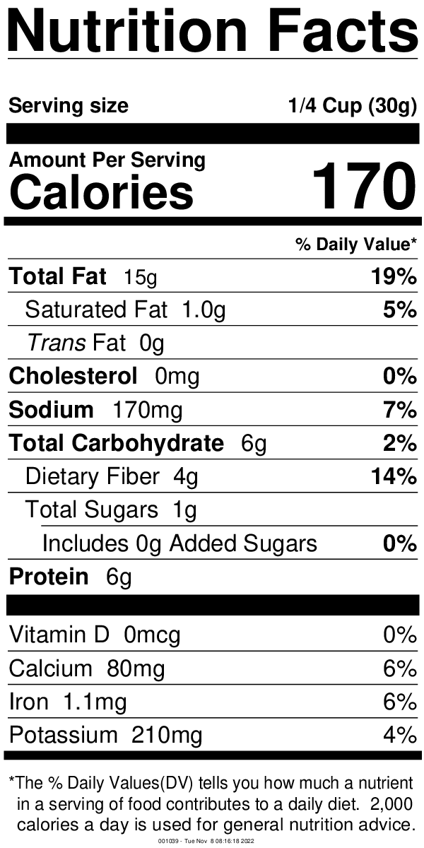 | Ingredients | Marcona Almonds, Sunflower Oil, Black Truffle Salt (sea salt, dried truffle, natural truffle flavor), Garlic. |