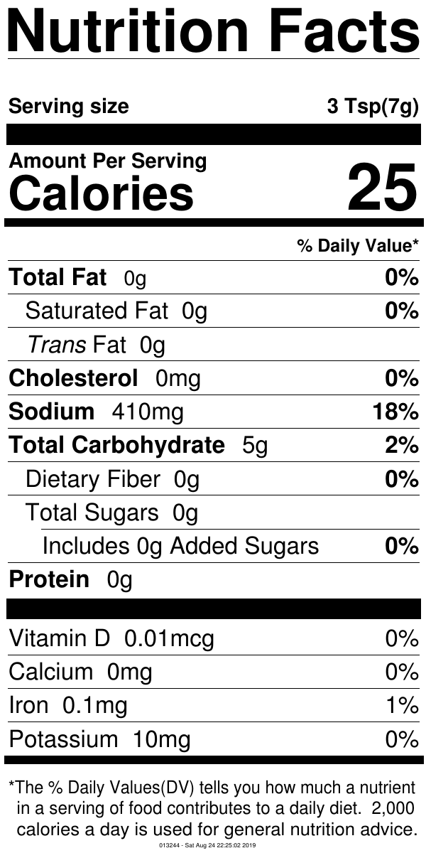 | Ingredients | Maltodextrin, Salt, Autolyzed Yeast Extract, Natural Flavor, Dehydrated Vegetables (onion, celery, parsley, spinach, garlic, carrot), Potato Flour, Xanthan Gum, Spices, Extractive of Spices (including turmeric), Soy Lecithin (emulsifier), Soybean Oil. |